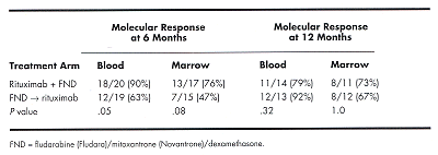 CONCLUSION: At 6 months a higher molecular response in PB wasseen in the concurrent rituximab + FND arm; the same trend was seen in BM, butat 12 and 18 months the molecular response rate was equivalent for both arms.The projected failure-free survival (FFS) rate at 24 months is 88% for PBmolecular responders at 6 months vs 34% for nonresponders (P = .05). Atthis point there is no significant difference in FFS between the two arms of thestudy, although the trend favors the concurrent arm.