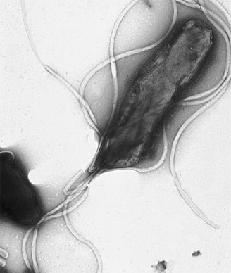 Electron micrograph of H pylori possessing multiple flagella (negative staining); source: Yutaka Tsutsumi, MD, Wikimedia Commons