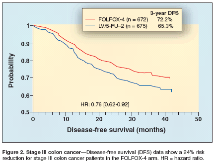 BOURNEMOUTH, UnitedKingdom-Treatment with the FOLFOX-4 regimen (loading dose of fluorouracil[5-FU] followed by infusional5-FU, leucovorin [LV], oxaliplatin[Eloxatin]) may be preferable to 5-FU/LV in high-risk stage II colon cancerpatients, investigators for a retrospectivemulti-country study haveconcluded (abstract 3619).The European-Israeli study is a prespecifiedsubgroup analysis of MOSAIC(Multicenter International Studyof Oxaliplatin/5-FU/Leucovorin in theAdjuvant Treatment of Colon Cancer),the recent randomized 2,200-patient trial that established FOLFOX-4 as the first regimen to improve 3-yeardisease-free survival versus standard5-FU/LV (N Engl J Med 350:2343-2351, 2004).Strong DFS Benefit