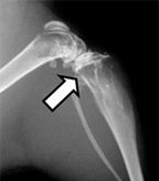 Representative x-ray image from hindlimbs of mouse, arrow indicates osteolytic lesion; source: Dunn LK et al.