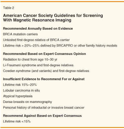 Although a reduction in breast cancer mortality has not been demonstrated with MRI screening in high-risk women, the higher detection rate of cancer-particularly invasive cancer-with MRI, coupled with the earlier stage at detection led the American Cancer Society to conclude that sufficient evidence exists to recommend annual MRI screening for women proven to be mutation carriers, untested first-degree relatives of mutation carriers, and women with a lifetime risk of breast cancer development of 20% or greater as determined by models based on a family history of breast cancer.[8]