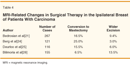 A smaller number of studies have examined the actual impact of MRI findings on surgical therapy, and these are summarized in Table 4.[21,24-26] In three of the four studies,[21,24,25] performance of a mastectomy that would not otherwise have been done was the most common outcome. Berg et al[24] observed that MRI resulted in wider excision than initially planned in 30% of women undergoing breast-conserving surgery, although disease extent was overestimated in 20 of the 29 patients. Overall, MRI resulted in management changes in 20% to 55% of women in these studies.