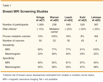 Five prospective, nonrandomized screening trials comparing the use of mammography and MRI in high-risk women are summarized in Table 1.[3-7] Women were eligible for these trials if they had a lifetime risk of breast cancer development of at least 15%, and the proportion of proven BRCA1/2 mutation carriers ranged from 8% in the study by Kuhl et al[3] to 100% in the study by Warner et al.[6] In spite of the heterogeneity in study designs, the results of these trials are remarkably similar. The sensitivity of MRI for the detection of cancer ranged from 77% to 100% and was substantially higher than that observed for mammography (25%–40%). In all of the studies, the specificity of MRI was lower than that of mammography, although in the majority of the reports the difference was less than 5% (Table 1).