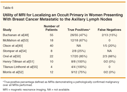 One goal of resecting the primary tumor is to minimize the residual tumor burden that must be controlled by radiotherapy, thereby decreasing the risk of local recurrence. Although studies examining the utility of MRI for identifying occult primary breast cancers are small, most series demonstrate that detection of a primary lesion occurs in at least 60% of women (Table 6).[48-55] False-positive findings occur in 0% to 29% of cases,[48,49,51] but false-negative results are uncommon. Identification of the primary tumor allows both resection and the use of a boost dose of radiotherapy to maximize local control. Good local control can be achieved with breast conservation for lesions seen solely on breast MRI, indicating that an axillary presentation is not indicative of a biologic tumor type that should be preferentially treated by mastectomy.[49]