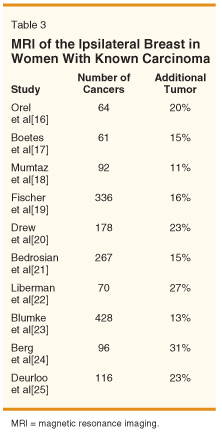 The background information discussed above is useful when considering the role of MRI in treatment selection for the woman with known carcinoma. At present, local recurrence due to improper patient selection or inadequate local therapy is infrequent. Yet a substantial number of studies have demonstrated that the performance of MRI in women with localized cancers identifies additional tumor foci in 11% to 31% of cases (Table 3).[16-25] The demonstration of these additional tumor foci has been used to argue that MRI should be a routine part of the preoperative evaluation of women with breast carcinoma.
