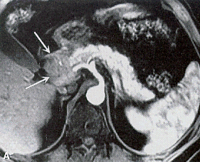 Arterial-phase gadolinium-enhanced MRI showing a pancreatic head mass (arrows)