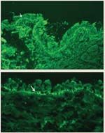 It was not until progression of his mucosal manifestations that a larger left buccal surgical biopsy was performed and the specimen sent for direct immunofluorescence (DIF), which strongly favored PNP (Figure 5). On receipt of the DIF results, the patient was started on 1mg/kg of oral prednisone, and a specimen was sent for indirect immunofluorescence (IIF). The staining pattern was diagnostic for PNP: prominent IIF staining was observed when the patient’s serum was cultured on mouse bladder and mouse tongue. IIF staining on monkey esophagus was also observed at a dilution of 1:80.