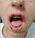 Worsening of the oral lesions was noted seven weeks after prednisone was started, so a difficult multidisciplinary decision was made to start the patient on IVIg in the setting of ongoing CHOP therapy, oral cyclosporine, and a corticosteroid taper. Rituximab was not reinitiated because of the agent’s black-box warning regarding severe mucocutaneous reactions, limited data on its use in the setting of pulmonary involvement, and the fact that the patient began experiencing PNP-related symptoms while undergoing lymphoma treatment with rituximab. The addition of IVIg led to a complete resolution of the patient’s cutaneous lesions and a substantial improvement in his mucosal and ocular lesions, which allowed him to eat solid foods and to visualize objects clearly and without photophobia. One month later, the patient was admitted for fever and worsening shortness of breath; the repeat bronchoscopy demonstrated aspergillosis, and voriconazole (Vfend) was started. During the same hospital stay, a CT scan demonstrated stable lymphomatous masses after cycles 5 and 6 of chemotherapy, with an overall response of 39%. A repeat pulmonary evaluation one month later showed no signs of infection. However, the patient’s respiratory status declined over the next few months, and he experienced multiple admissions, increasing oxygen requirements, and the need for mechanical ventilation. He passed away 11 months after being diagnosed with follicular lymphoma and 9 months after recognition of the associated PNP.