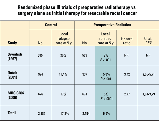 Radiotherapy improves local control. In general, preoperative treatment is preferred to postoperative treatment. Recently, several randomized trials have confirmed the value of short-course preoperative radiotherapy and long-term fractionated preoperative radiotherapy with concurrent chemotherapy for local disease (see Table on page 25). In all the studies, short-course preoperative radiotherapy increased local control over surgery alone.