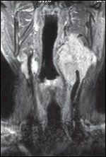 Although CT is the study of choice for the evaluation of bone involvement, magnetic resonance imaging (MRI) provides meticulous soft-tissue detail and defines skull-base, intracranial, dural, and neural involvement, especially with the use of gadolinium enhancement (Figure 4).[28] Augmented by its ability to produce images in multiple planes, MRI is superior to CT in defining the relationship of paragangliomas to adjacent vascular and skull-base structures.