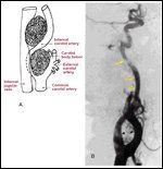 Tumor location, displacement of major vessels, and patterns of involvement or invasion of surrounding structures aid in the diagnosis of paraganglioma. For example, carotid body tumors typically display the common carotid bifurcation with posterolateral displacement of the internal carotid artery (Figure 3A).[27] By contrast, vagal paragangliomas will displace both the internal and external carotid arteries anteriorly (Figure 3B), and are associated with erosion and widening of the jugular foramen.