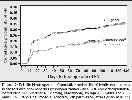 Cancer is a disease of the elderly, and its incidence and mortalityincrease with age. The number of persons with cancer is expected todouble between 2000 and 2050, from 1.3 million to 2.6 million, withthe elderly accounting for most of this increase. Studies have shownthat otherwise-healthy older patients treated with chemotherapy of similarintensity obtain benefits comparable to those obtained by youngerpatients. However, chemotherapy-induced neutropenia and its complicationsare more likely in older patients; they are also more often hospitalizedbecause of life-threatening infectious complications. Furthermore,most neutropenic episodes in elderly patients occur in the earlycycles of chemotherapy. To minimize the occurrence of chemotherapyinducedneutropenia, older patients are often treated with less-aggressivechemotherapy and with dose reductions and delays, which maycompromise treatment outcome. The proactive management ofmyelosuppression is therefore essential in elderly patients. Research todetermine the predictors for neutropenia has found that age itself is asignificant risk factor. The benefit of treating elderly patients withcolony-stimulating factors is well established, with their use beginningin the first cycle of chemotherapy being crucial for minimizing neutropeniaand its complications and facilitating the delivery of full-dosechemotherapy. Such prophylaxis should be routinely considered in elderlypatients with cancer treated with myelosuppressive chemotherapy.