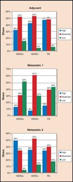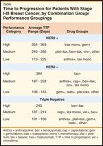 We looked at the time-to-progression (TTP) associated with certain drug regimens in metastatic breast cancer in order to see how long it took for patients’ disease to progress while they were receiving selected combinations; we looked at real-world data, which are far removed from the kinds of results we see reported in randomized clinical trials. We grouped patients presenting with breast cancer stages I-III according to receptor status: patients were thus placed into a HER 2+, HER2–, or borderline group. We additionally isolated a subset of patients within the HER2– group, those with triple negative disease (Figure 1). We then grouped the women by their drug therapies and their drug therapies’ TTP performance category (Table).