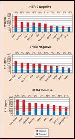 The highest-performing group of regimens in the first-line metastatic setting, as judged by average TTP, varied by receptor status. Among stage I-III patients with HER2+ disease, trastuzumab monotherapy and gemcitabine-containing combinations yielded the longest TTP-about 350 days-while taxane-containing combinations and bevacizumab plus taxanes yielded the longest TTP in HER2– and triple negative patients, respectively.