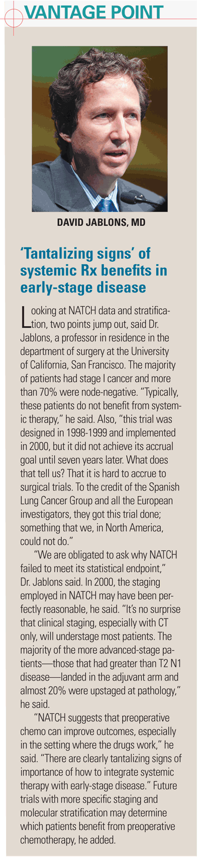 NATCH (Neoadjuvant or Adjuvant Chemotherapy in Patients With Operable Non-Small Cell Lung Cancer) is the only study to date prospectively designed to compare two distinct experimental arms with surgery alone, which is the current standard of care in early disease. The primary endpoint in the NATCH trial was five-year disease-free survival (DFS).