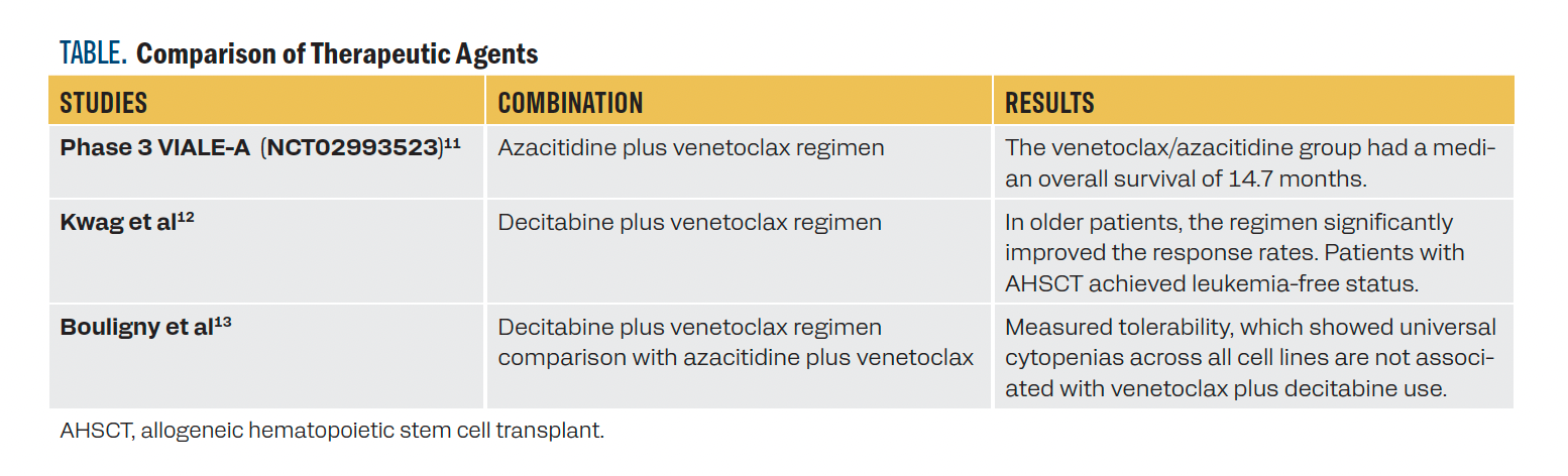 Patients with AML generally receive intensive chemotherapy as their primary treatment, which is far more dangerous and toxic, can lead to prolonged hospitalizations, and increases the risk for cardiologic and neurologic deficits. Alternatively, venetoclax with low-dose cytarabine is cost-effective, less toxic, and less hazardous to health than intensive chemotherapy.14 Acomparison of different therapeutic combinations used in 3 studies is presented in the Table.