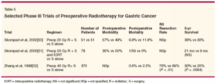 The rationale for neoadjuvant radiation is reduction of local and regional recurrences. External-beam radiation therapy also has a palliative role for the management of bleeding tumors. The location and extent of tumor is best imaged in the preoperative setting. As mentioned earlier, delivery of radiation therapy preoperatively may enhance efficacy, reduce treatment volumes, and decrease toxicity. Almost one-third of the radiation fields had to be redesigned in the postoperative adjuvant setting in the Intergroup 0116 trial.[15] Preoperative EBRT allows the patient a better chance of receiving all available therapies, as postoperative morbidity after gastrectomy is not insignificant. Table 5 shows trials comparing preoperative radiation plus surgery with surgery alone. These studies used EBRT doses between 20 and 40 Gy. However, more current combinedmodality regimens utilize EBRT doses up to 45 Gy (Table 6). Zhang et al demonstrated a significant improvement in 5-year survival after 40 Gy was given preoperatively.[52] There did not appear to be an increase in postoperative morbidity related to the therapy; these studies indicated a trend toward improved survival. Preoperative Chemo-RT