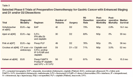 Davies et al demonstrated that gastric cancer patients who underwent subtotal gastrectomy enjoyed superior quality of life at the end of 1 year as compared with total gastrectomy patients.[23] Proximal gastric resection is associated with a higher risk of anastomotic leakage and bile-acid reflux. This complication may be prevented by jejunal interposition.[9] Based on the above observations, it may be worthwhile to investigate neoadjuvant therapy followed by proximal gastrectomy as a possible alternative to total gastrectomy for proximal gastric cancers. A recent trial by Bosing et al revealed a dismal 14% 5-year survival in patients with AEG type III tumors, despite surgery.[24] Linitis plastica and signet-ring histology are other gastric cancer subtypes that have a poor outcome with surgical therapy alone.[25] Thus, patients with stages II, IIIA, or IIIB (locally advanced) proximal tumors or those with aggressive histology are likely to benefit from neoadjuvant therapy, as surgery alone is usually not curative in these cases. The Role of Adjuvant Therapy The use of postoperative adjuvant chemoradiotherapy for gastric cancer gained popularity after a randomized trial by Macdonald et al.[15] The trial showed improved survival in the adadjuvant therapy arm receiving 45 Gy of radiotherapy and three cycles of fluorouracil (5-FU) and leucovorin compared to surgery alone. Median overall survival in the surgery-only group was 27 months, as compared with 36 months in the chemoradiotherapy group (P = .005). Critics of this trial note that over half of the patients received inadequate lymphadenectomy (most had D0 dissection); hence, adjuvant therapy may have been advantageous for these patients, many of whom possibly had residual nodal disease. In the Western world, adjuvant therapy is considered standard of care since the rate of R0 resection (microscopically negative postoperative margins) remains suboptimal. The role of adjuvant therapy after D2 dissection is unproven. Neoadjuvant Therapy