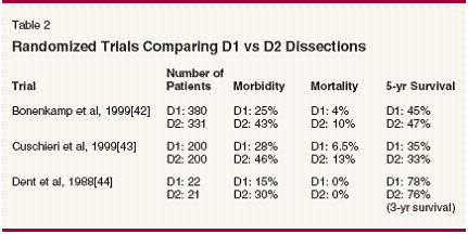 National Comprehensive Cancer Network (NCCN) guidelines recommend a multidisciplinary approach to staging that includes a complete history and physical examination, laboratory studies (complete blood count, platelet count, and serum biochemistry), esophagogastroduodenoscopy, chest radiography, and computed tomography (CT) of the abdomen and pelvis. Laparoscopy has also been added to these guidelines as a category 2B recommendation (nonuniform consensus among panel members).[16] Table 1 depicts the various staging modalities available for gastric cancer, along with accuracy, advantages, and disadvantages. The use of positronemission tomography (PET) for staging, detecting recurrence, and evaluating response to therapy in gastric cancer is evolving. A recent study in esophageal cancer suggests that quantitative measurements of tumor 18F-fluorodeoxyglucose (FDG) uptake may predict histopathologic tumor response and patient outcome as early as 2 weeks after initiation of preoperative chemotherapy.[ 17] This may be a useful investigational tool in gastric cancer as part of a neoadjuvant strategy. The recent availability of integrated CT/PET imaging is likely to refine staging of these tumors in the future. Japanese investigators use a computer- based program (the Maruyama program) to predict lymph node stations at risk for metastasis in particular cases. The cases are sorted on the basis of similarity with seven specified variables: age (± 5 years), sex, Borrmann type of the tumor, greatest dimension of the tumor as measured on the luminal surface (± 2.5 cm), location of the tumor, estimated tumor depth, and histology. Comparison is made with a database of 3,843 gastric cancer patients at the National Cancer Center Hospital in Tokyo who had been treated by D2 or more extensive lymphadenectomy. The program then predicts the percentage likelihood of disease at each of the 16 lymph node stations around the stomach on the basis of actual patient experience.[18] This information could be used prospectively to enroll higher-stage patients into neoadjuvant programs. The Role of Surgery Surgical resection remains the only curative therapy for this disease. The debate continues regarding the optimal extent of lymph node dissection required for maximal therapeutic benefit. Extended lymphadenectomy remains the standard of care in the Far East at the cost of acceptable postoperative morbidity.[19] Similar results could not be reproduced in Western trials and no survival advantage was attributed to D2 dissections in the Dutch Gastric Cancer Group trial.[14] Similar results were noted in the Medical Research Council (MRC) trial from the United Kingdom.[13] The results of randomized control trials comparing D1 with D2 dissections are depicted in Table 2. These randomized trials did not reveal any survival advantage for D2 dissection. Morbidity and mortality associated with D2 dissection was significantly higher in these randomized trials. Five-year survival after D1/D2 dissection remains dismal at 30% to 45%. Thus, no phase III study in the Western population has proved the therapeutic advantage of D2 dissection. Cochrane database review done by McCulloch et al revealed survival benefit of D2 dissections in T3 or more advanced lesions.[20] Subgroup analysis of the MRC trial suggests a survival advantage for stage II and III patients or those with N1 disease.[13] The Dutch Gastric Group trial indicated a survival benefit for N2 patients.[ 14] Siewert et al, in a large prospective multicenter observational trial, found that the pathologic subgroup of pT2, N1 and pT3, N0 had a significant survival benefit with extended lymph node dissection.[21] The extent of gastrectomy may also impact on postoperative morbidity and quality of life. Due to high incidence of locoregional failure, multifocal disease, and submucosal pattern of spread, total gastrectomy with at least a 5-cm gastric margin is recommended for proximal gastric tumors.[9] Subtotal gastrectomy is often the procedure of choice for distal (antral) tumors.[22] Although total gastrectomy is superior in terms of margin-free resection, this procedure is associated with postoperative morbidity of dumping syndrome, malabsorption, anemia, osteoporosis, and malnutrition. Quality- of-life impairment results from these difficulties.