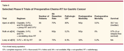 Given the benefit of single-modality treatment (chemotherapy or radiation) preoperatively in gastric cancer and the experience using preoperative chemo-RT in other gastrointestinal malignancies, such as esophageal and rectal cancer, preoperative chemo- RT strategies for gastric cancer appear logical. However, experience in this area is rather limited. Trials investigating preoperative chemo-RT for gastric cancer are depicted in Table 6. These studies indicate that combined-modality therapy, consisting of chemo-RT followed by surgery, is well tolerated, without significant increase in morbidity or mortality. These studies utilized cisplatin and 5-FU- based regimens. It is possible that use of newer radiation sensitizers such as docetaxel, irinotecan (Camptosar), oxaliplatin (Eloxatin), or gemcitabine (Gemzar), alone or in combination, may yield higher pathologic responses.