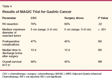 Two elements of the study design of the MAGIC trial deserve mention. First, about 11% of patients had distal esophageal cancer. A prior Intergroup study in esophageal cancer revealed no survival advantage with preoperative chemotherapy; however, there are limited data in gastric cancer.[29] This may confound study results. In addition, neither endoscopic ultrasonography nor diagnostic laparoscopy was performed to accurately assess stage of disease preoperatively. Despite these problems, the MAGIC trial is the first well-powered, randomized, controlled phase III trial that demonstrates the safety and feasibility of perioperative chemotherapy. Final efficacy results of this study are eagerly anticipated. The Swiss study SAKK 43/99 compares preoperative docetaxel (Taxotere), cisplatin, and 5-FU followed by surgery, vs surgery followed by the same chemotherapy regimen. The EORTC 40954 trial compares surgery plus preoperative cisplatin, leucovorin, and 5-FU with surgery alone. The results of these trials will help establish whether there is a benefit of neoadjuvant chemotherapy and may provide information regarding the superiority of specific neoadjuvant chemotherapy regimen. Preoperative EBRT