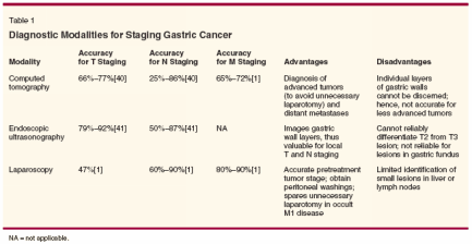 In the United States and Europe, potentially curative resections (with negative margins, R0) are possible in only about 50% of newly diagnosed gastric cancer patients.[9-11] For patients with locally advanced tumors (stages II, IIIA, or IIIB) even after gastric resection with curative intent, the recurrence rate is as high as 40% to 65%.[12] As most cases are diagnosed at an advanced stage, there is clearly a need to develop innovative treatment strategies that will downstage the tumor, increase the R0 resection rate, and decrease the risk of recurrence after surgery. Adjuvant chemoradiation is commonly used postoperatively for gastric cancer. The ability to deliver adjuvant chemoradiation is adversely influenced by the 25% to 46% postoperative morbidity seen after gastrectomy with lymphadenectomy.[13,14] Only 64% of patients completed adjuvant chemoradiotherapy in the important Intergroup 0116 trial.[15] Neoadjuvant therapy for gastric cancer is emerging as a promising approach. This article discusses the rationale for neoadjuvant therapy and the available therapeutic options. A brief overview of current staging and operative and adjuvant strategies is presented below as a preface to this discussion. Staging Strategies