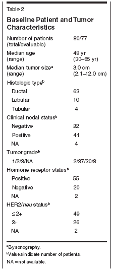 Through March 2003, 80 patients had been enrolled in the study; 3 patients were not eligible due to primary bone metastases, an uncontrolled psychiatric disorder, or chronic infectious disease. A total of 77 patients were evaluable for clinical and pathologic response, type of surgery, and toxicity.