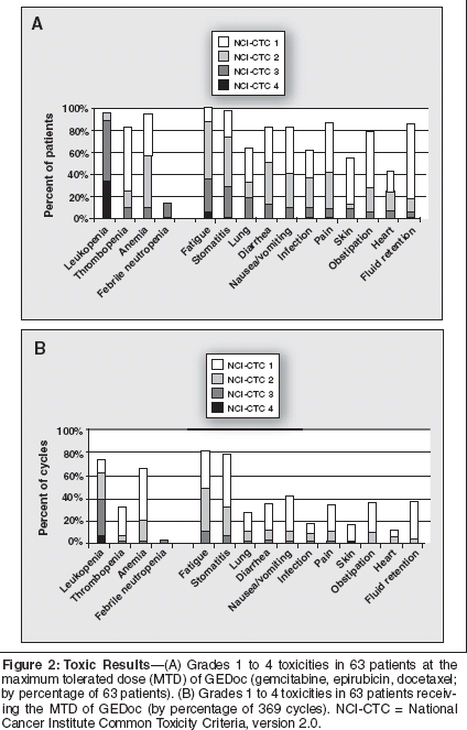 Primary study end points were to define the maximum tolerated dose and to evaluate clinical and pathologic response rates of GEDoc as primary systemic therapy. Secondary end points included the rate of breast-conserving surgery and toxicity. In addition, snap frozen tissue of pretreatment tumor biopsies were collected, and DNA microarray analyses will be performed in the future to ascertain any predictive and prognostic gene expression signatures. This aspect of the study is based on data from van de Vijver et al, who described a gene expression signature in primary breast cancer with prognostic value superior to that of currently used clinical parameters.[ 21] The DNA microarray analyses will be performed in a blinded fashion regarding clinical outcomes by Peter Lichter, PhD, at the German Cancer Research Center in Heidelberg, Germany. Results of these analyses will be correlated with clinical and pathologic responses, time to progression, survival, and toxicity. Results