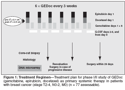 In early breast cancer, primary systemic (preoperative, neoadjuvant) and adjuvant (postoperative) chemotherapy are equally effective with regard to effects on disease-free and overall survival.[1] Primary systemic therapy, however, increases the possibility for breast-conserving surgery, and tumor response may be a surrogate marker for chemotherapy efficacy against micrometastases.[2] Patients with pathologic complete remission (pCR) after primary systemic therapy experience significantly improved survival as compared with patients with persistent, invasive tumor.[3] A significant increase in the pCR rate might translate into improved survival.[4] Rationale for Combining Gemcitabine, Epirubicin, and Docetaxel As a single agent, gemcitabine (Gemzar) is active in chemotherapynaive and previously treated patients with metastatic breast cancer.[5] Because of its favorable toxicity profile[ 6] and lack of complete cross-resistance, particularly with anthracyclines[ 7-10] and taxanes,[11] gemcitabine has been evaluated in different combination regimens for the treatment of advanced breast cancer. In particular, results of two trials of the triplet combination of gemcitabine, anthracycline, and paclitaxel administered as first-line therapy showed remarkable overall response rates of 92% and 83% and complete response rates of 31% and 44%, respectively.[ 12,13] Therefore, it seemed reasonable to evaluate this combination as primary systemic therapy in patients with primary breast cancer in an attempt to improve the pCR rate and survival.