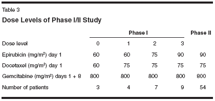 Thus far, results of four phase II studies evaluating gemcitabine-containing regimens as primary systemic therapy in primary breast cancer are available.[14-17] All investigators reported promising clinical and pathologic response rates (Table 1). Gomez et al treated 39 patients with stage IIIB breast cancer with gemcitabine at 1,200 mg/m2/d on days 1 and 8 and doxorubicin at 60 mg/m2 on day 1 every 3 weeks for three cycles.[14] The overall clinical response (cR) rate was 95% (clinical complete response [cCR] rate, 18%), and the pCR rate was 13% (3 of 23 evaluable patients).[ 14] Silva et al reported cR, cCR, and pCR rates of 91%, 21%, and 17% (4 of 23 evaluable patients), respectively, among 34 patients with stage IIIA-IIIB primary breast cancer who received gemcitabine at 1,200 mg/m2 on days 1 and 8 plus epirubicin (Ellence) at 75 mg/m2 on day 1 every 3 weeks * 3.[15] Snchez-Rovira and colleagues completed a phase II study with preoperative biweekly gemcitabine at 2,000 mg/m2, doxorubicin at 40 mg/m2, and paclitaxel at 150 mg/m2 for six cycles, with granulocyte colony-stimulating factor [G-CSF] support. Doses were modified after the first six patients had received gemcitabine (2,500 mg/m2), doxorubicin (30 mg/m2), and paclitaxel (135 mg/m2). Among 45 evaluable patients, the cR, cCR, and pCR rates were 98%, 42%, and 18%, respectively.[13,16] Conte et al presented preliminary results of a phase II study using gemcitabine at 1,000 mg/m2 on days 1 and 8, epirubicin at 90 mg/m2 on day 1, and paclitaxel at 175 mg/m2 on day 1 every 3 weeks for four cycles in patients with stage II-III primary breast cancer. In the first 22 evaluable patients, the cR, cCR, and pCR rates were 96%, 32%, and 23%, respectively.[ 17] In all studies, toxicity was mild to moderate and manageable. All investigators used paclitaxel as the taxane compound. In randomized trials comparing doxorubicin and taxane as monotherapy in advanced breast cancer, however, paclitaxel showed similar or inferior efficacy as compared with doxorubicin,[18,19] whereas docetaxel (Taxotere) achieved higher response rates than did doxorubicin.[20] Therefore, it seemed reasonable to substitute paclitaxel with docetaxel and evaluate docetaxel in combination with gemcitabine and anthracycline as primary systemic therapy in patients with primary breast cancer. Phase I/II Study of Gemcitabine/Epirubicin/ DocetaxelPatients and Methods