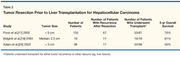 19. Majno PE, Sarasin FP, Mentha G, et al: Primary liver resection and salvage transplantation or primary liver transplantation in patients with single, small hepatocellular carcinoma and preserved liver function: An outcome-oriented decision analysis. Hepatology 31:899-906, 2000.