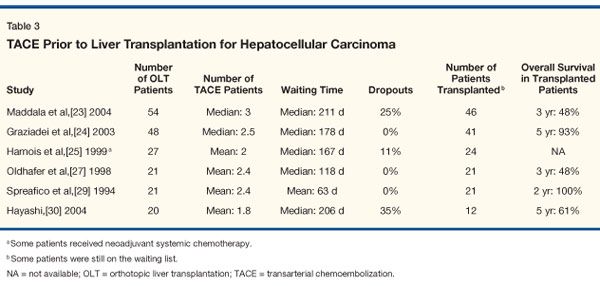 In another small study, Troisi et al compared patients who underwent pretransplant TACE and PEI to those who received no therapy prior to OLT. After 48 months of follow-up, disease-free survival was 82 % in 14 patients who underwent pretransplant TACE and PEI, compared to 65% in 6 patients who did not receive pretransplant therapy. [26] The authors concluded that a combination of TACE and PEI very effectively induces necrosis of tumor nodules, leading to improved disease-free survival.