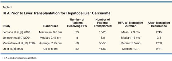 8. Lu DS, Yu NC, Raman SS, et al: Percutaneous radiofrequency ablation of hepatocellular carcinoma as a bridge to liver transplantation. Hepatology 41:1130-1137, 2005.