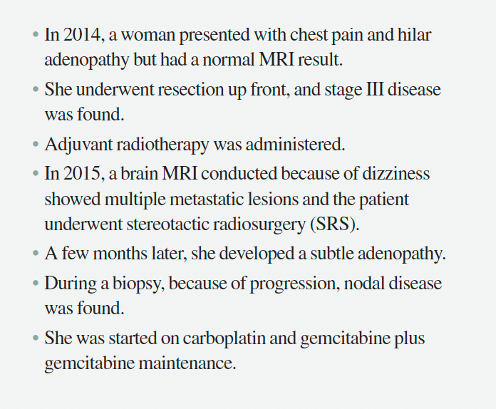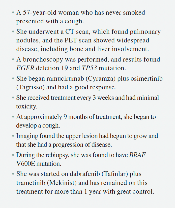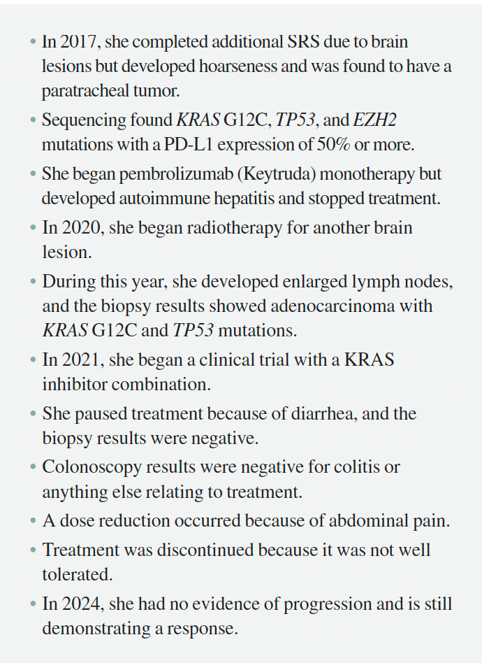 Patel / We have 2 approved KRAS inhibitors, and both have weaknesses such as CNS penetration, gastrointestinal toxicity, and the inability to combine one of them with immunotherapy. There are a number of exciting KRAS inhibitors on the horizon that are easier to combine. This patient’s been on [a KRAS inhibitor] for a long time; it’s nice that you’ve seen continued CNS response. That’s exciting. This pivoting of the difficulty in combination strategies with the available TKIs is a hurdle right now.