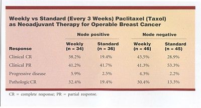 Of 70 node-positive patients, 68 were evaluable; of 91 node-negative patients, 89 were evaluable. Among the 157 evaluable patients to date, the overall pathologic complete response was significantly improved by the weekly schedule vs the standard schedule, approximately 30% vs 15% (see Table), Dr. Green reported.