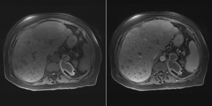 A 63-year-old man with neuroendocrine tumor (NET) metastatic to the liver undergoes magnetic resonance imaging (MRI) for evaluation of response to therapy. The patient reports an episode of left upper quadrant pain (unrelated to trauma) that occurred several weeks earlier. Noncontrast (left) and postcontrast (right) T1-weighted images with fat suppression are available for review.