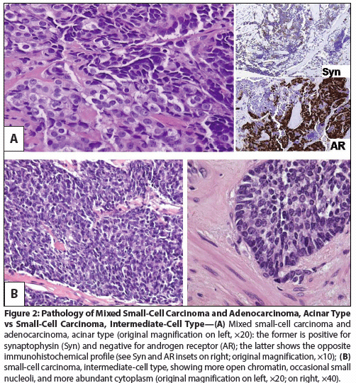 Figure 2: Pathology of Mixed Small-Cell Carcinoma and Adenocarcinoma, Acinar Type vs Small-Cell Carcinoma, Intermediate-Cell Type