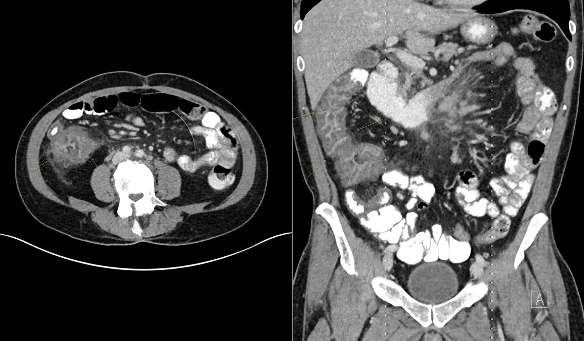 A 30-year-old man who recently underwent induction chemotherapy for bone marrow transplant is admitted with neutropenia and right lower-quadrant abdominal pain. Coronal and axial images from a contrast-enhanced CT scan of the abdomen and pelvis are seen below (white dots and partial circle on images are artifacts).