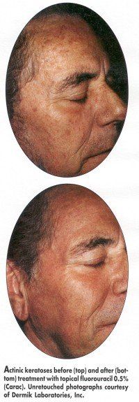 The third step, chemical treatment with a fluorouracil cream, he said, is useful for removal of flat superficial actinic keratoses and also as an adjunct to cryosurgery for targeting areas of invisible "pre-actinic keratoses."