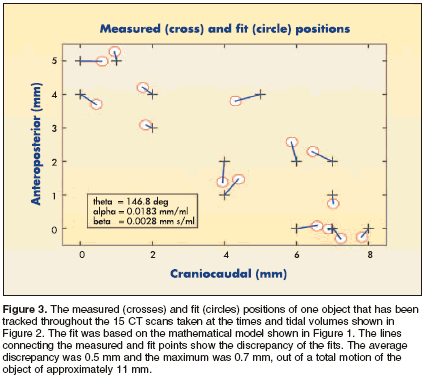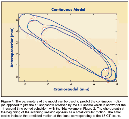 In addition, most radiation oncologygroups use coached breathing, inwhich patients are instructed when andhow to breathe during scanning. "Wehave very specifically avoided coachedbreathing because we want to understandhow well these models workwhen a patient is not concentrating onthe breathing process," Dr. Low said.Instead, patients are simply told not tomove during scanning.Developing the ModelThe investigators first assessed theperformance of a 4D CT process inwhich multislice CT scans were sorted(gated) by tidal volume. Each of 12patients with lung cancer underwent15 consecutive CT scans while spirometrymeasurements were obtained.The scans were sorted and reconstructedto create a 4D dataset. Analysesshowed near-perfect correlation betweentidal volume and the motion ofinternal objects, which was assessedfrom internal air content on the CTscan. In addition, the reconstructed4D dataset had high accuracy and highprecision (mean, 6%).They then developed a mathematicalbreathing-motion model based on5 dimensions-the spatial location ofthe object (x, y, and z) during a referencebreathing phase, tidal volume,and airflow (see Figure 1). To test themodel, they compared the actual positionsof 40 moving objects in thelung on CT scans obtained duringbreathing with the predicted positionsfrom the model (see Figures 2-4). Thiscomparison revealed "incredibly goodfits," Dr. Low said. The objects trackedmoved 4 to 11 mm during breathing,and the mean discrepancy betweenactual and predicted locations wasabout .5 mm.Although the model had been welltested in only one patient at the timeof the ASTRO meeting, its excellentperformance was especially noteworthybecause that patient had widelyranging tidal volumes, according toDr. Low. "This patient was not a regularbreather by any means. The patientbreathed little breaths, bigbreaths, medium breaths, and ourmodel just did not care. It did justfine," he said, noting that models thatassume constant tidal volume wouldhave been inaccurate by large margins.