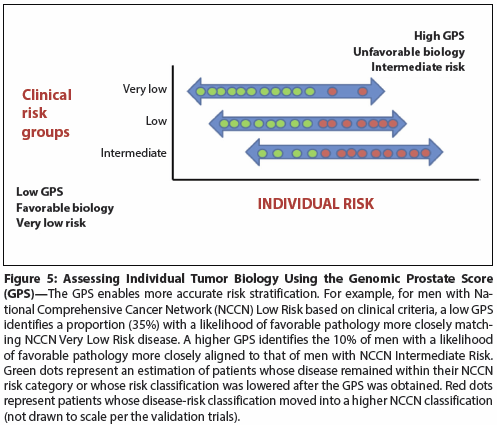 In men who have very low–, low-, and low-intermediate–risk PCa, Oncotype DX has been prospectively validated as a biopsy-based predictor of adverse pathology. The Genomic Prostate Score (GPS) adds independent predictive information beyond standard clinical and pathologic measures (Figure 5). The GPS assesses underlying biology from very small biopsy tumor volumes, addressing issues of tumor heterogeneity and biopsy under-sampling to more accurately predict disease aggressiveness. Incorporation of the GPS enables more accurate identification of a larger population of patients who can more confidently choose active surveillance as an initial management strategy. This test has been validated from biopsy material and adds to other clinical parameters such as National Comprehensive Cancer Network (NCCN) scores.[33,34]