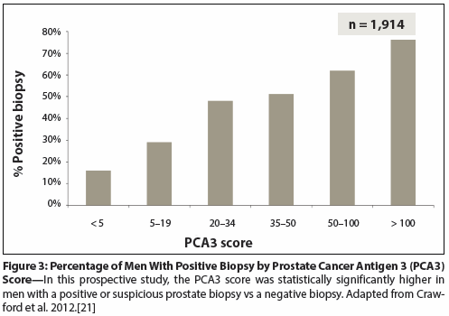 PCA3 is a noncoding messenger RNA that has been shown to be elevated in > 90% of men with PCa, but not significantly elevated in normal prostatic glands or in benign prostatic hypertrophy. PCA3 is unique in that it can be measured in urine and adds to the diagnostic information obtained from the PSA test, with higher area under the curve (AUC) values of 0.66 to 0.72, compared with 0.54 to 0.63 for serum PSA alone.[20] PCA3 complements the PSA test in men undergoing initial biopsy.[21] In 2012, PCA3 was approved by the FDA as a diagnostic test for PCa in the setting of a previous negative prostate biopsy. PCA3 is also considered to be helpful in deciding when to re-biopsy and in the follow-up of patients under active surveillance (Figure 3).[21] The mean PCA3 score was statistically significantly higher in men with a positive biopsy, or those with atypical small acinar proliferation (ASAP) and/or high-grade prostatic intraepithelial neoplasia (HGPIN), compared with men who had a negative biopsy.[21]