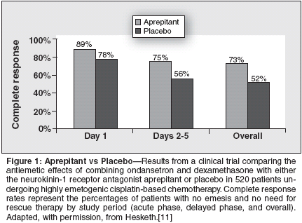 Poli-Bigelli S, Rodrigues-Pereira J,Carides AD, et al, Aprepitant Protocol 054Study Group: Addition of the neurokinin 1 receptorantagonist aprepitant to standard antiemetictherapy improves control of chemotherapy-induced nausea and vomiting: Resultsfrom a randomized, double-blind, placebo-controlledtrial in Latin America. Cancer 97:3090-3098, 2003.