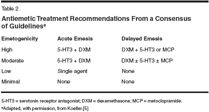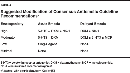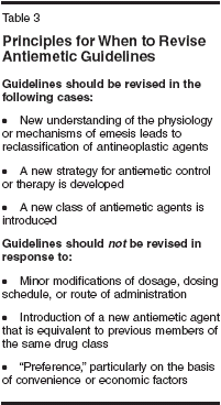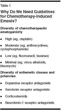Guidelines for the management of chemotherapy-induced emesisare necessary to help clinicians match the emetogenicity of antineoplasticagents with the abundance of antiemetic agents now available. Numerousguidelines for antiemetic therapy currently exist, but compliancewith them is inconsistent, in part because optimal antiemetic protectionis not yet possible, even with the best guidelines. For this reason,guidelines must be dynamic and evolve as knowledge increases.Revision of antiemetic guidelines should be prompted by changes ingeneral principles of treatment, not changes in specific details. Recentrecognition of the unique benefits of incorporating selective neurokinin-1 receptor antagonists into regimens for the prevention of nauseaand vomiting caused by highly emetogenic chemotherapy, particularlyin delayed emesis, justifies modification of existing antiemeticguidelines.