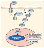 The RAS gene also activates MAPK, among other signaling pathways. In malignant cells, point mutations within discrete domains of the RAS gene result in permanent activation of the mutant protein and corresponding activation of downstream signaling pathways. Point mutations of RAS seem to occur in all types of thyroid follicular cell-derived adenomas and carcinomas, suggesting that RAS mutations represent an early event in thyroid tumorigenesis.[29]