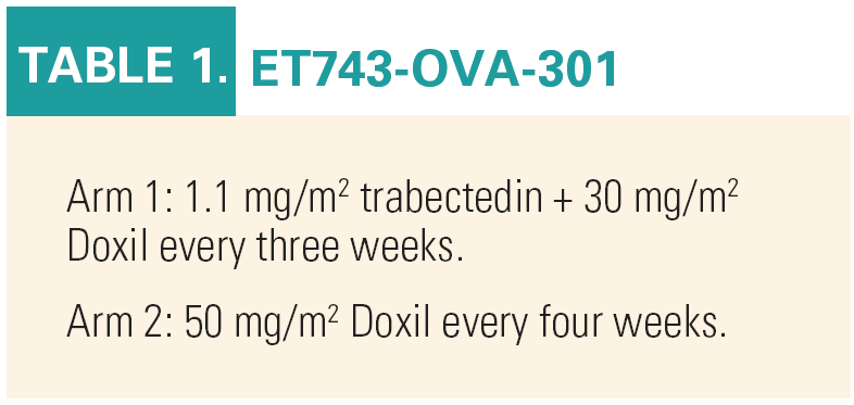 The international pivotal clinical trial (ET743-OVA-301) was an open-label, phase III study comparing trabectedin/Doxil with Doxil alone. The primary endpoint was progression-free survival (PFS).