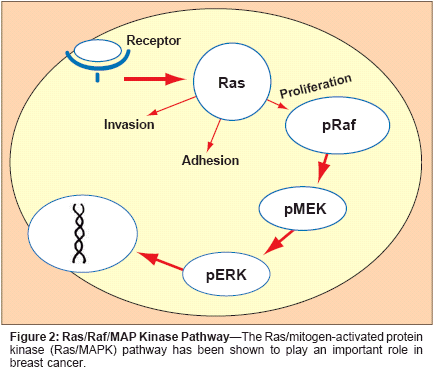 The Ras proteins are guanine nucleotide-binding proteins that play apivotal role in the control of normaland transformed cell growth. Followingstimulation by several growthfactors and cytokines, Ras activatesmultiple downstream effectors. TheRas/mitogen-activated protein kinase(Ras/MAPK) pathway plays animportant role in breast cancer(Figure 2).[25]Although