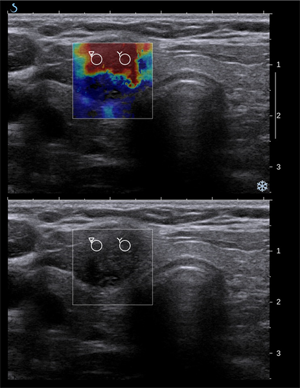 Papillary thyroid carcinoma on elastography (top) and ultrasonography (bottom); source: Wikimedia Commons, Oreo Priest