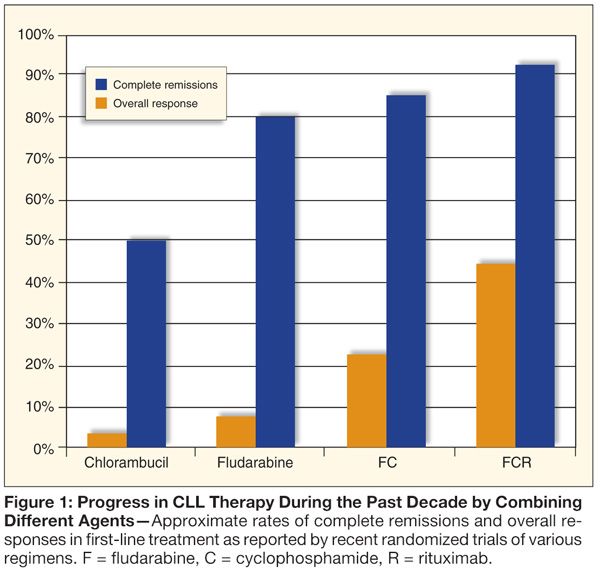 Chronic lymphocytic leukemia (CLL) is a heterogeneous disease with an extremely variable course. Survival after diagnosis can range from months to decades. As the pathogenesis of the disease is increasingly understood, we begin to unfold the molecular patterns that define the different prognostic subgroups and to develop strategies to predict the clinical course. In addition, a number of more potent treatment modalities have been designed during the past 10 years that allow us to achieve complete remissions in almost 50% of patients and to obtain a treatment-free time of more than 5 years (Figure 1).
