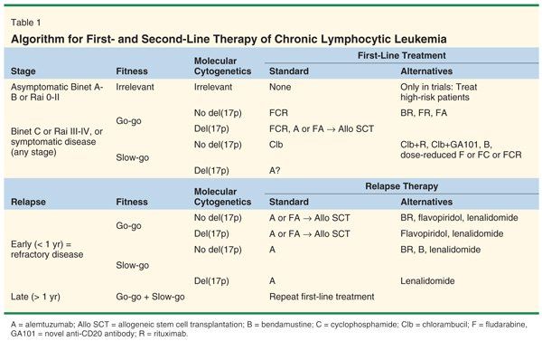 Patients with early-stage disease (Binet A/B, Rai 0–II) without symptoms usually do not require therapy. Early treatment is currently tested in clinical trials for patients at high risk. In patients with advanced (Binet C, Rai III-IV) or active, symptomatic disease, treatment should be initiated. In this situation, patients need to be evaluated for their physical condition (or comorbidity). To patients in good physical condition (“go-go”), as defined by a normal creatinine clearance and a low score on the cumulative illness rating scale (CIRS),[1] an FCR combination therapy should be offered. Patients with relevant comorbidity (“slow-go”) may be offered either chlorambucil (Leukeran) or a dose-reduced fludarabine-containing regimen for symptom control.